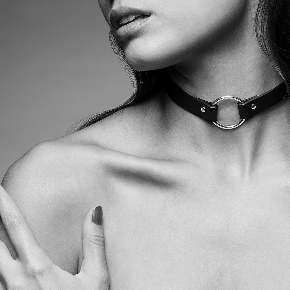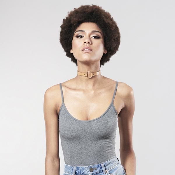 幅が若干狭いスッキリとしたデザインのため、シンプルなデザインのトップスなら合わせやすいチョーカーです。肌に優しいビジュー・アンディスクレ開発のヴィーガンレザーを使用し、ベルト形状でサイズの調整が可能のため、首のサイズを気にせずフィットさせられます。あなたが持つキンキーな一面を表現してくれることでしょう。