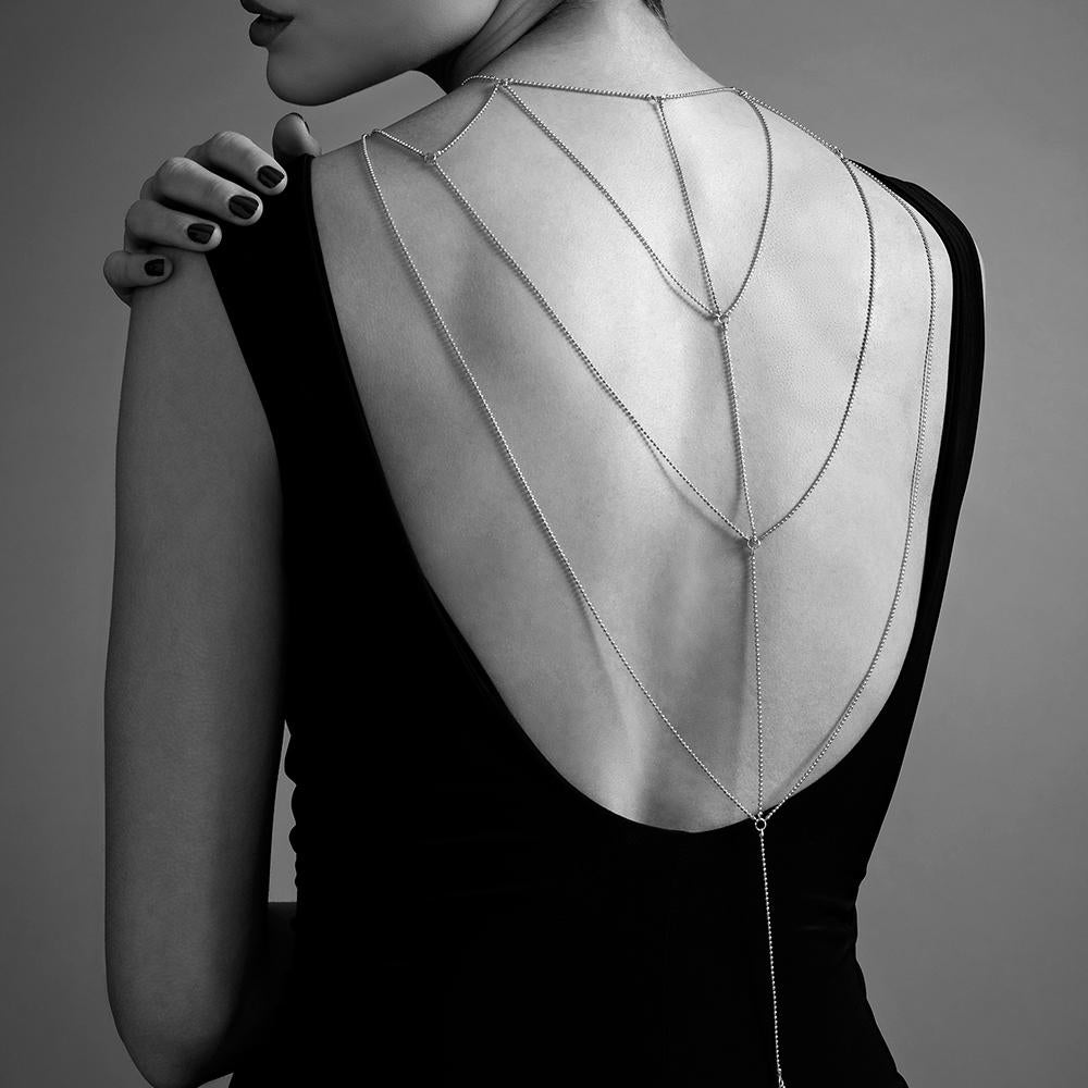 トライアングル形状のボディーチェーンです。大胆に背のあいたドレスやシンプルなトップスに合わせれば、魅惑的な美しさを引き出してくれます。