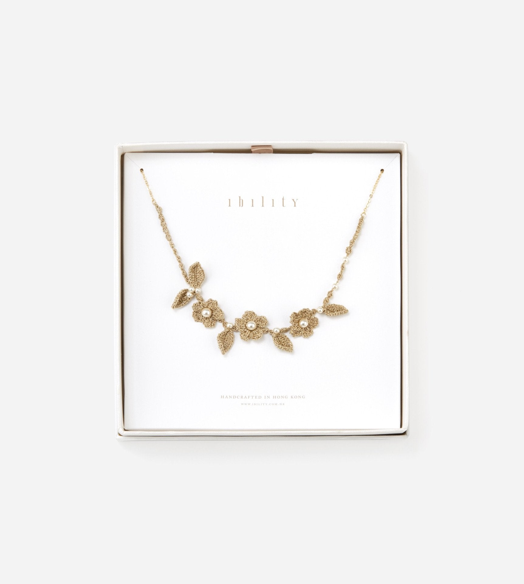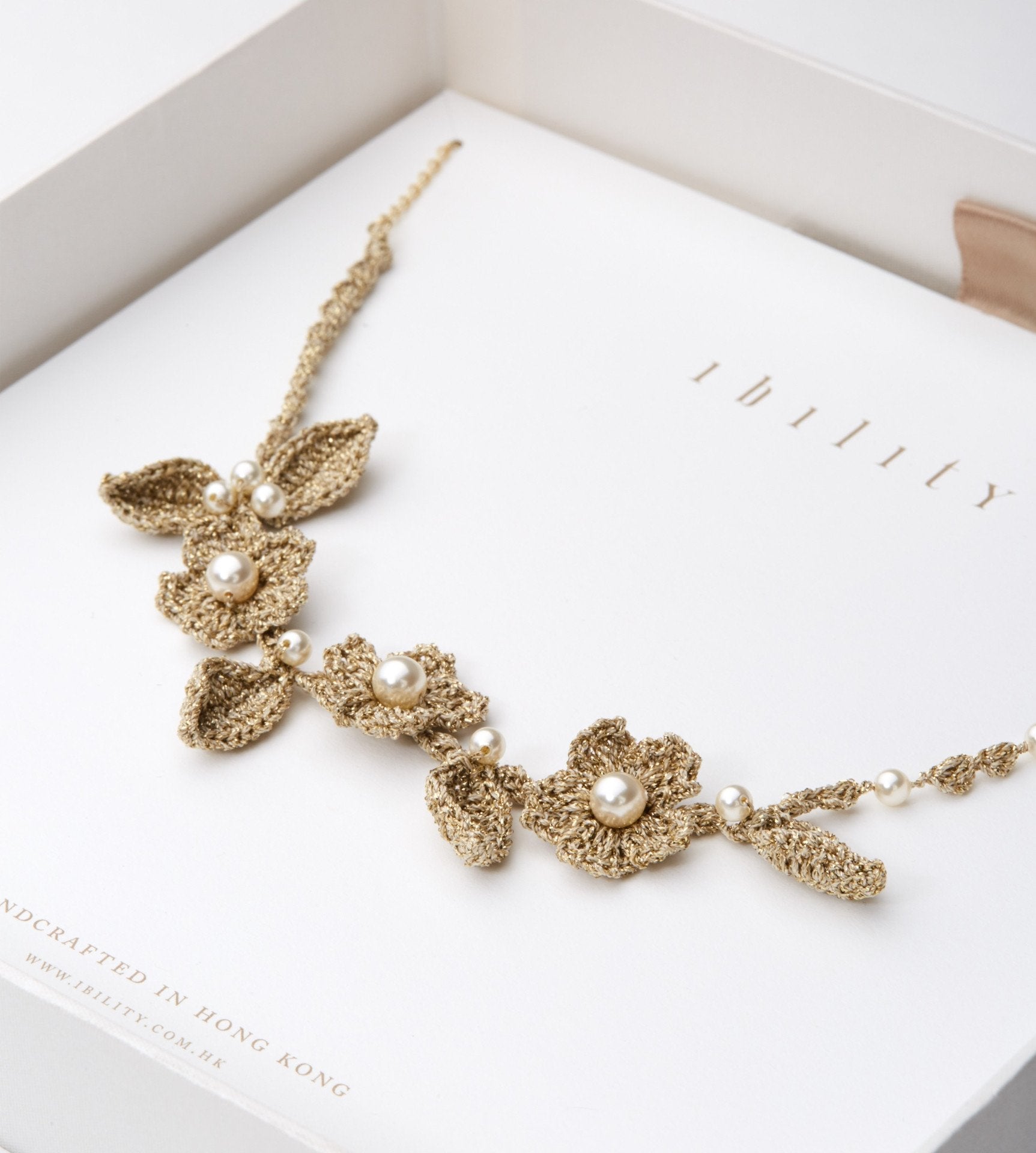 可愛らしい花と葉をモチーフにしたキラキラ光るゴールドクロシェにスワロフスキーパールを添え、ネック部はフロントとは雰囲気を変えたゴールドメッキのシルバーチェーンを構成。ボリューム感のあるネックレスがゴージャスでエレガントでしかもキュートに首元を飾ってくれます。45-55cm程度にアジャスタブルで、お洋服の胸元の開きに合わせやすくなっています。
