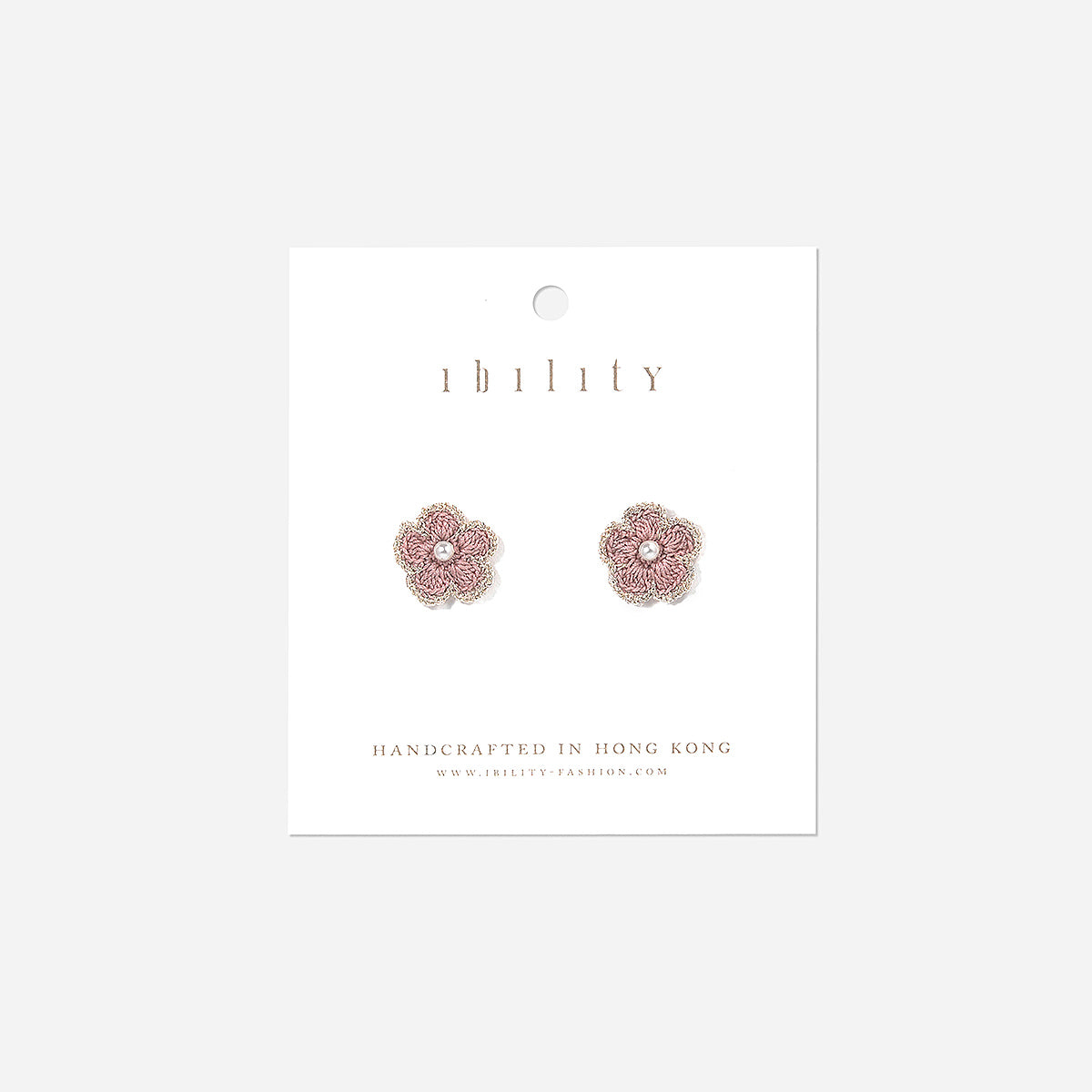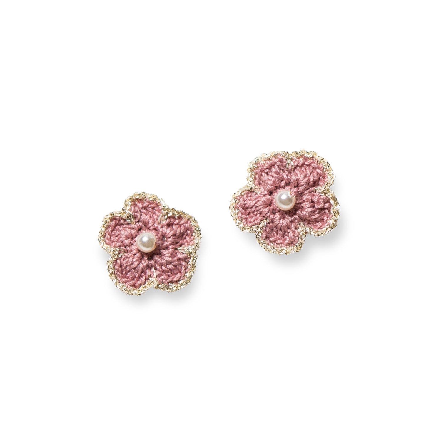 ゴールド糸の縁取りで取り囲んだ、小ぶりでかわいらしい花。綿の王様エジプシャンコットンを丁寧に編み込んだピアスです。花の中央にはスワロフスキーのクリスタルパールがあしらわれており、絶妙な色で染められた花びらのアクセントになっています。