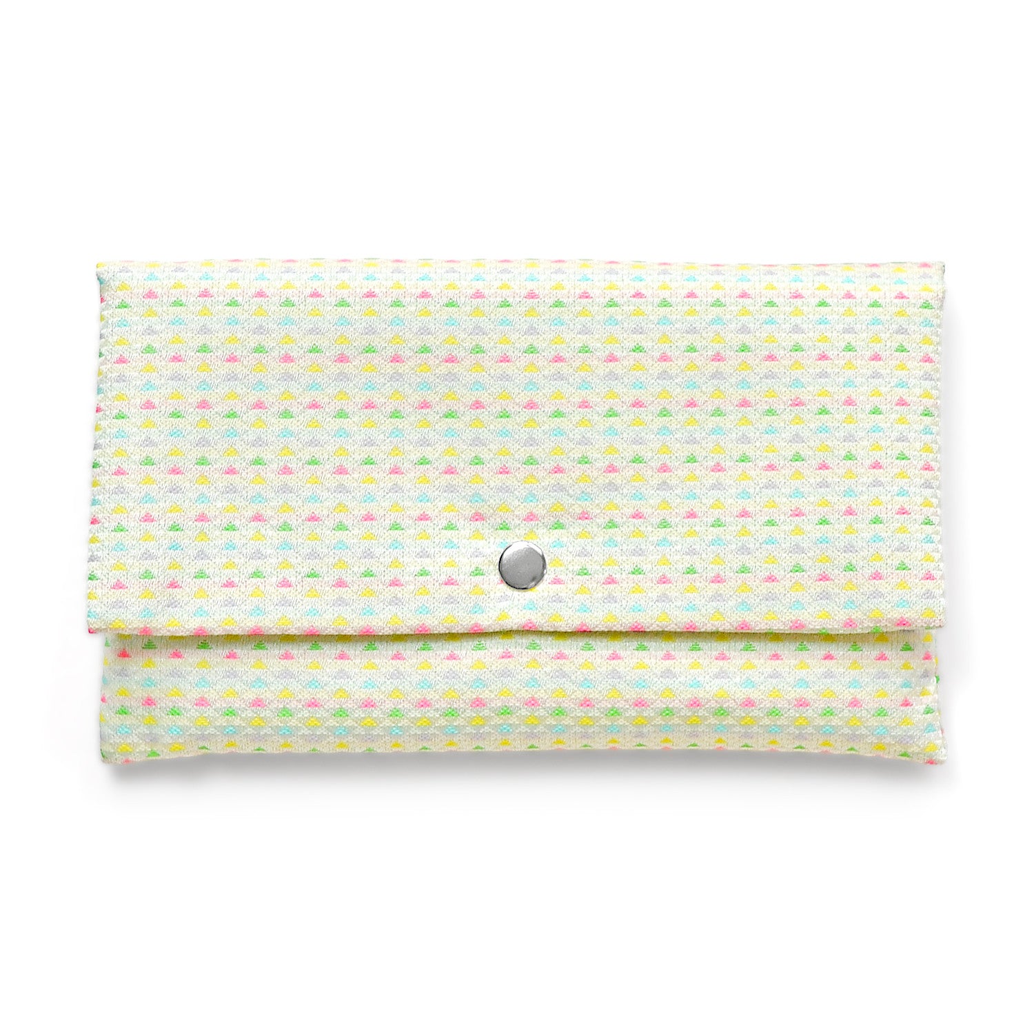 トライアングル・ホワイトは、キラキラと光るシャンパンゴールド系バックグラウンドに赤・青・黃・緑色の小さな三角形がオシャレに組み合わせたパターン。男性でもお使いいただきやすい柄です。