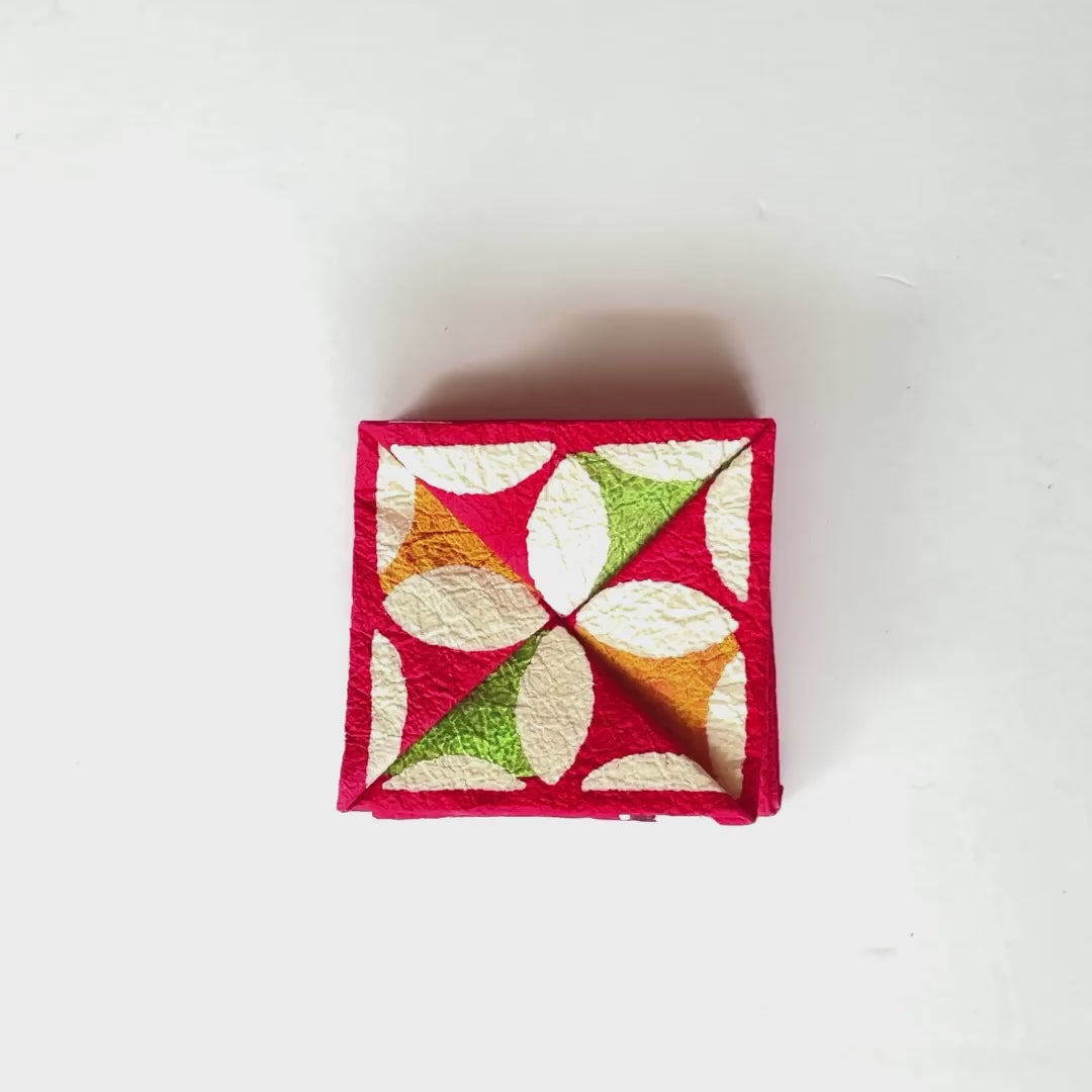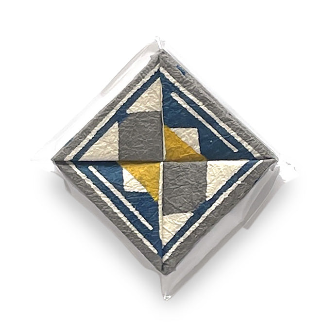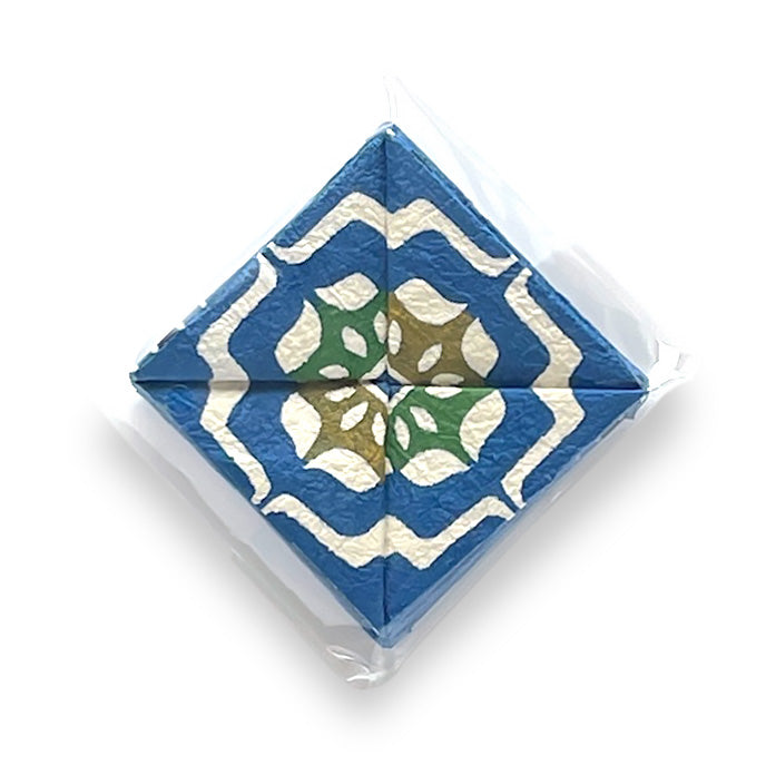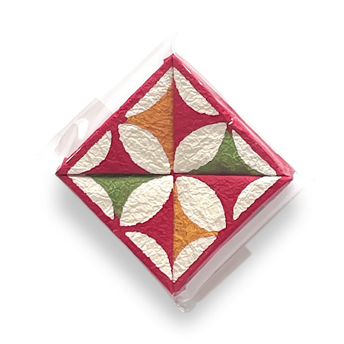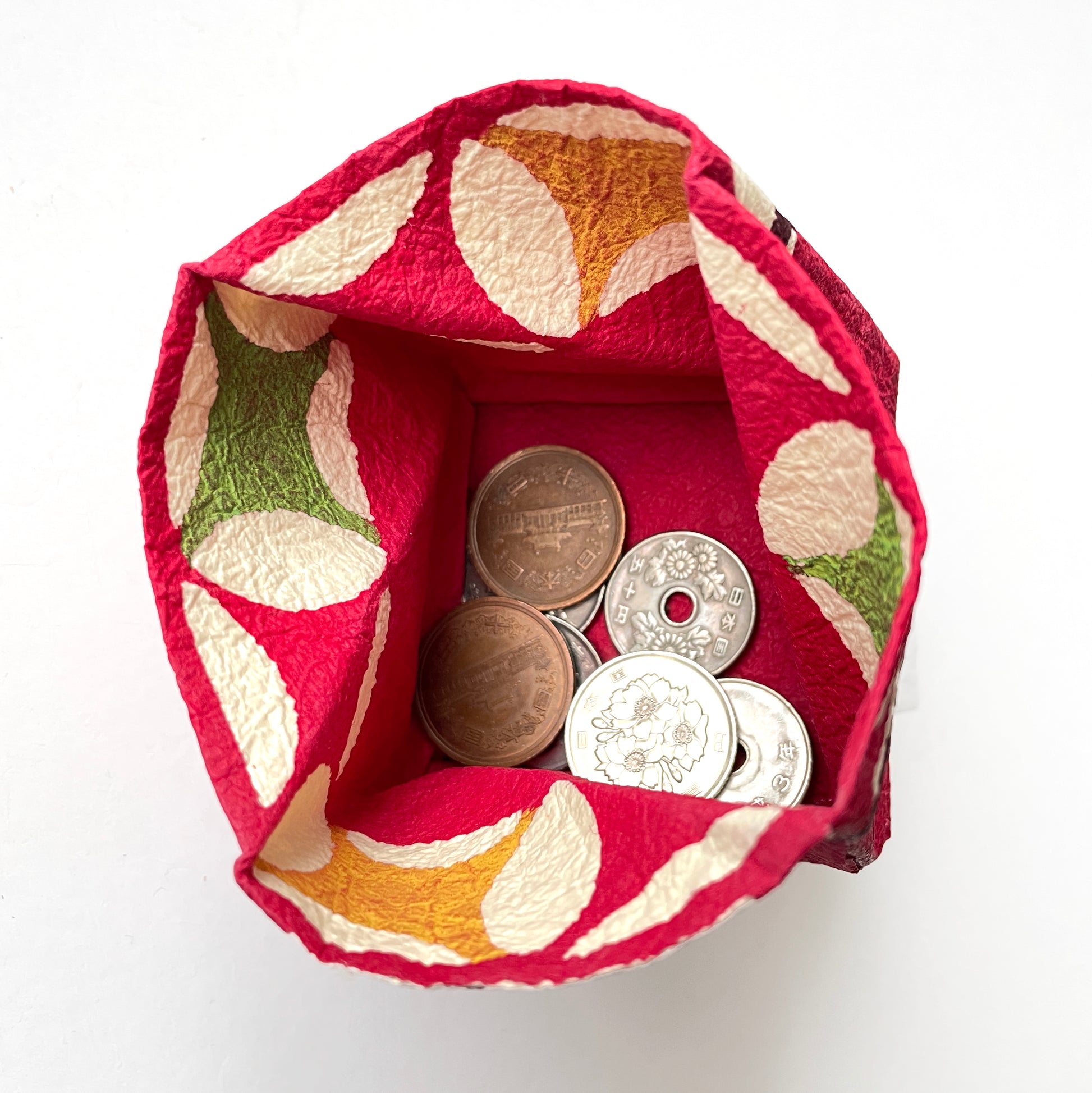 入口をつまんで引っ張ることで開閉する小銭入れです。日本の伝統的技術で製造した丈夫な和紙製で、折り紙をするように形成されています。