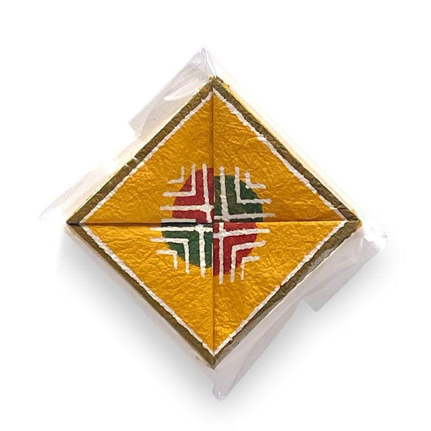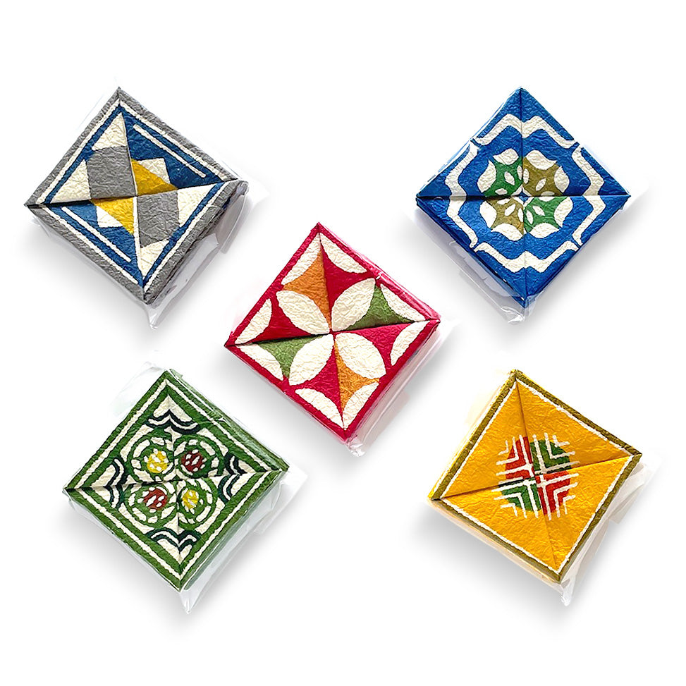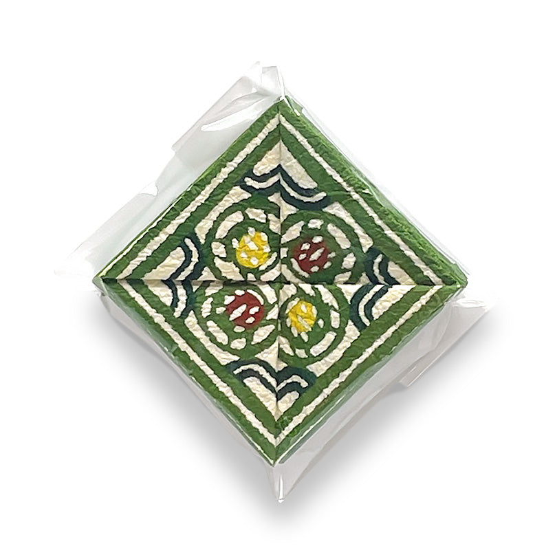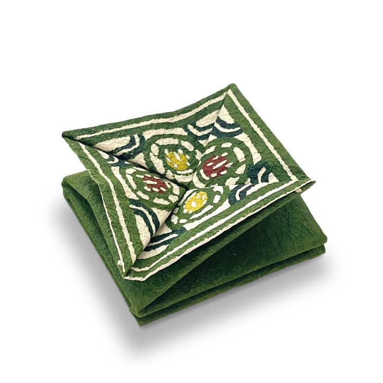 入口をつまんで引っ張ることで開閉する小銭入れです。日本の伝統的技術で製造した丈夫な和紙製で、折り紙をするように形成されています。